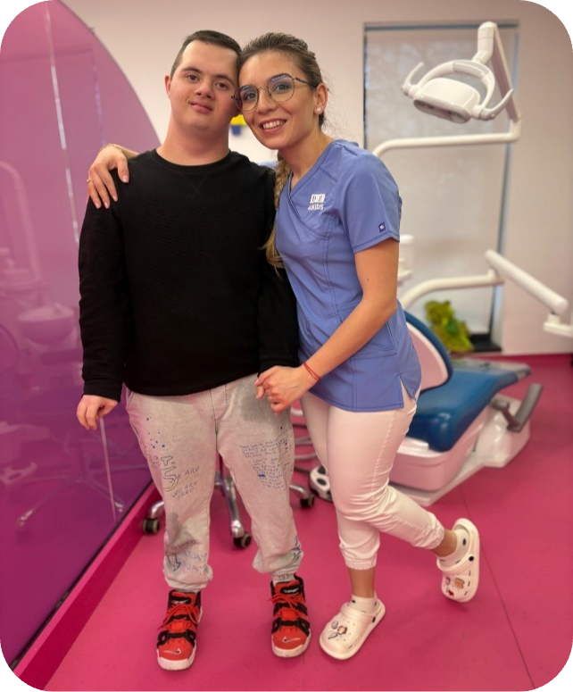 Al doilea pacient pe care doresc să-l prezint este Patrik, un tânăr adult de 18 ani, foarte special și drag mie, care, din păcate, se confrunta în acel moment cu multe probleme dentare (carii și resturi radiculare). Având parte de doi părinți foarte implicați, Patrik a fost dus la dentist, și, deși el probabil ar fi fost cooperant, medicii aveau rezerve și nu au realizat nicio intervenție. Chimia cu Patrik a fost extraordinară de la început, iar în urma acomodării blânde, am reușit să realizăm toate tratamentele necesare, sub anestezie locală, fără inhalosedare sau anestezie generală. Am realizat tratamente interdisciplinare, eu ocupându-mă de partea de odontoterapie, iar dr. Paul Brănuțiu de partea de terapie extracțională. Evident că după fiecare etapă parcursă cu succes, Patrik a avut parte de sesiuni de dans, colorat și picnic 😊. Pentru mine, aceste cazuri sunt satisfacția de zi cu zi, doza de energie și îmi arată că sunt exact acolo unde trebuie să fiu și fac exact ceea ce trebuie să fac, și sunt extrem de recunoscătoare pentru asta.